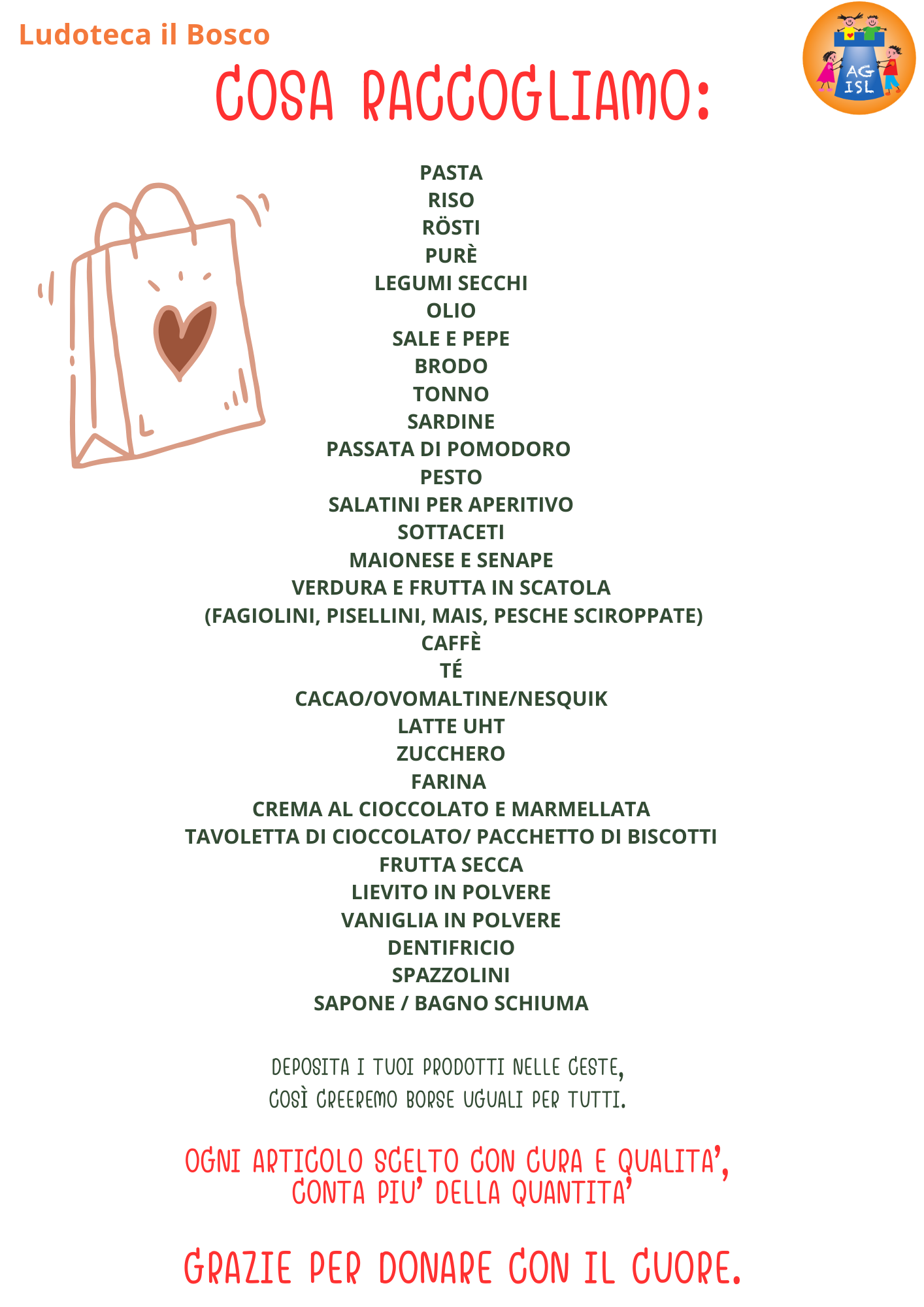 Durante la settimana dal 24.11 al 28.11 compreso, raccoglieremo alimenti a lunga conservazione e prepareremo delle borse della spesa regalo.